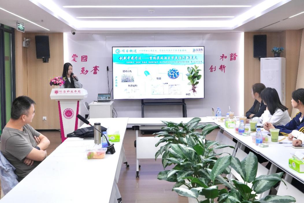 “风湿愈”团队对他们的项目展开详细分享。项目源于团队对类风湿关节患者“安全长效治疗”需求的关注,其核心产品“乌蛇定痛胶囊”通过两大技术突破传统治疗瓶颈——生物酶与显微结合技术,目前项目已获2项国家专利、发表核心论文,入驻学校孵化基地。对此,余育礼教授特别强调,需进一步落地品牌故事,如串联“中药世家传承”“东方美学”元素,同时明确供应链合作意向、细化风险应对执行表,让项目从技术优势向商业价值高效转化。