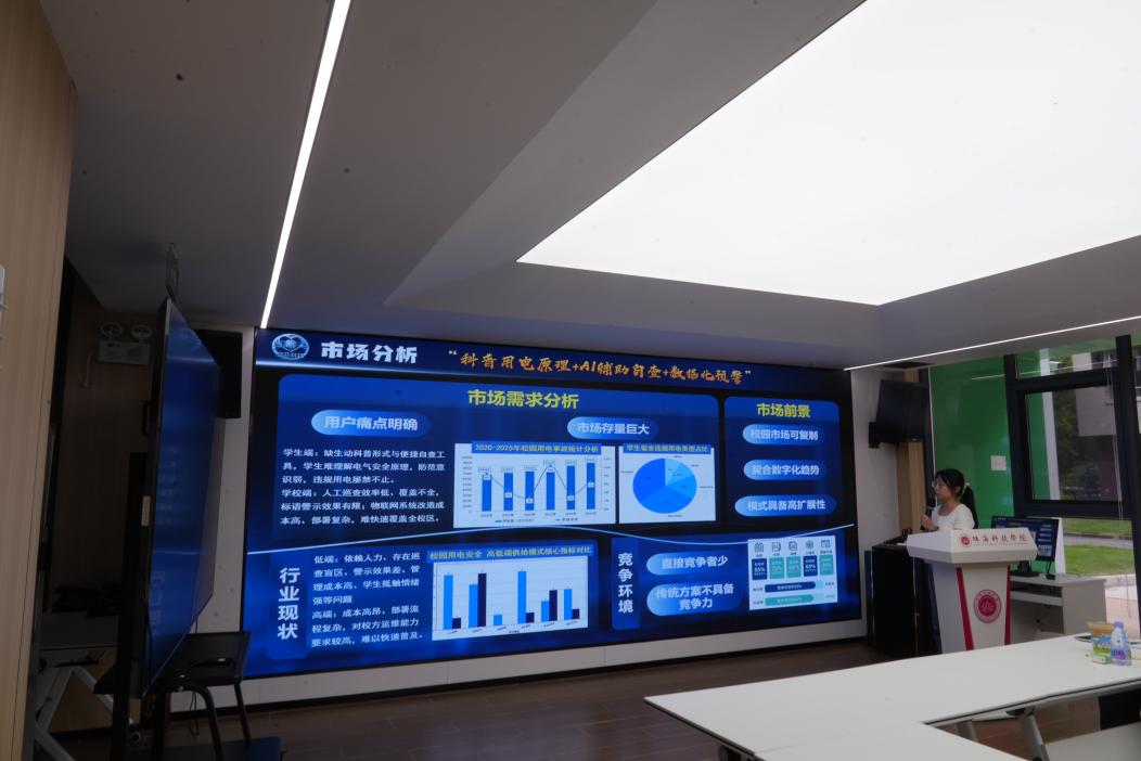 随后,“安芯科技”团队进行校园用电安全项目详细分享。该项目聚焦校园用电安全痛点,打造基于电路仿真+AI辅助识别的校园用电安全科普与隐患预警平台,以微信小程序为核心载体,构建“电路仿真科普-AI隐患识别-答题互动-隐患上报预警”全链路服务体系,精准解决学生用电认知盲区、学校人工巡查效率低下等行业问题,兼具公益科普与数字化管理双重价值。目前,项目已完成核心技术研发与小程序原型设计,同样成功入驻学校创业孵化基地。