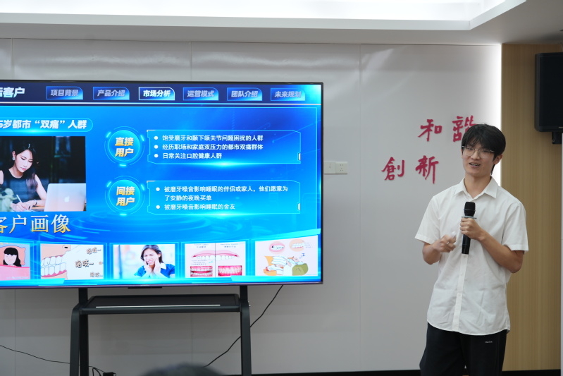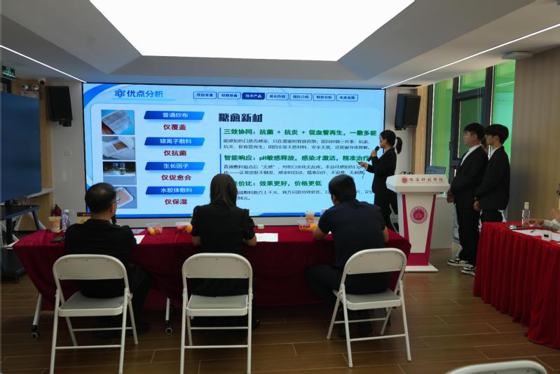 复赛现场,各参赛团队依次登台,围绕项目核心创新点、技术壁垒、市场验证、社会价值、落地规划展开全面汇报,展现了“敢闯会创”的青春风采。本届参赛项目呈现出鲜明特色,学科交叉融合态势凸显,多支队伍构建“理工类+经管类”复合型研发团队,跨界协同赋能创新突破,科创转化成效扎实,部分成果实现小批量投产、校企合作落地,深度契合高校科教融汇与成果转化建设要求,广泛聚焦乡村振兴、绿色低碳、健康中国等国家重点领域。其中,天然水凝胶基药物团队聚焦糖尿病慢性伤口治疗痛点,创新研发智能医用敷料,已通过技术实验验证创面加速愈合的应用潜力,成为兼具创新性与社会价值的典型代表。评委专家立足创新性、商业可行性、社会价值、落地潜力等关键维度,结合产业发展趋势与政策导向,对项目进行精准点评与专业指导。